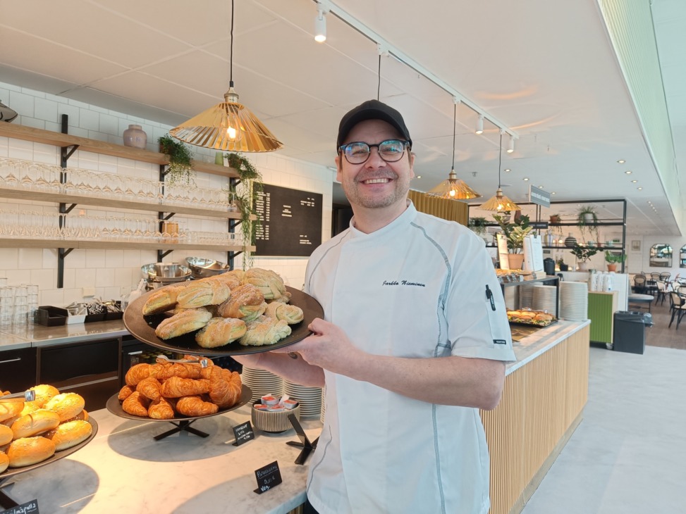 Keittiötoimenjohtaja Jarkko Nieminen, joka esittelee pistaasikierteitä. Ne ovat messukahviloiden suosituimpia pullia.