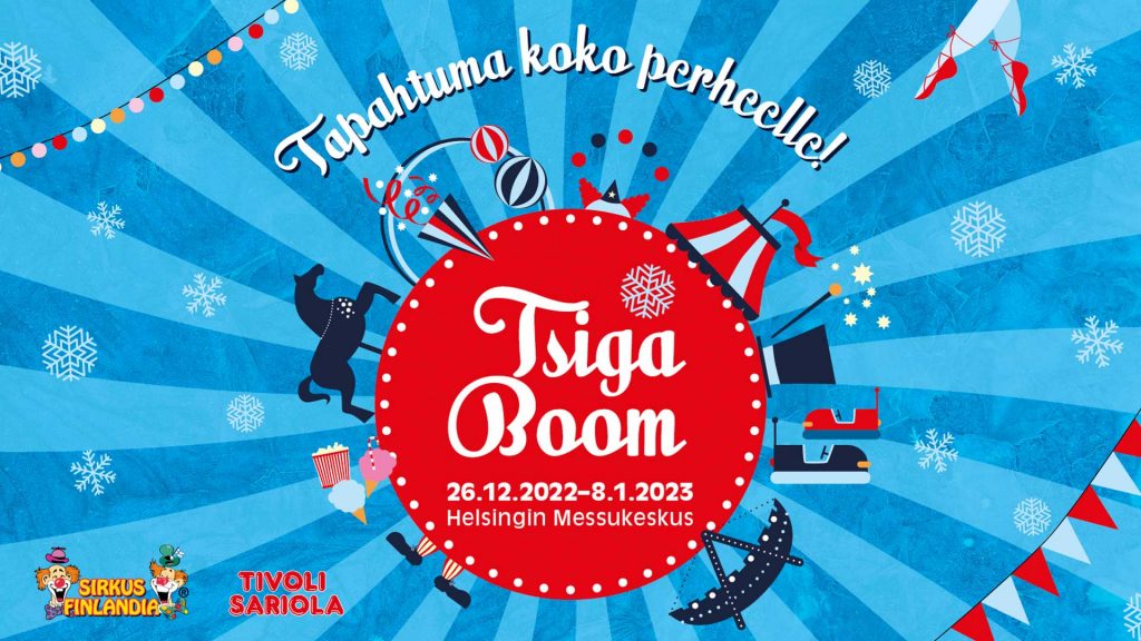 Helsingin Messukeskuksen halleissa avataan 26.12.2022 uusi koko perheen tapahtuma TsigaBoom! joka tarjoaa korkeatasoista sirkusviihdettä ja riemukasta menoa karuselleissa, pomppulinnoissa ja vatsanpohjaa nipistävissä tivolilaitteissa.